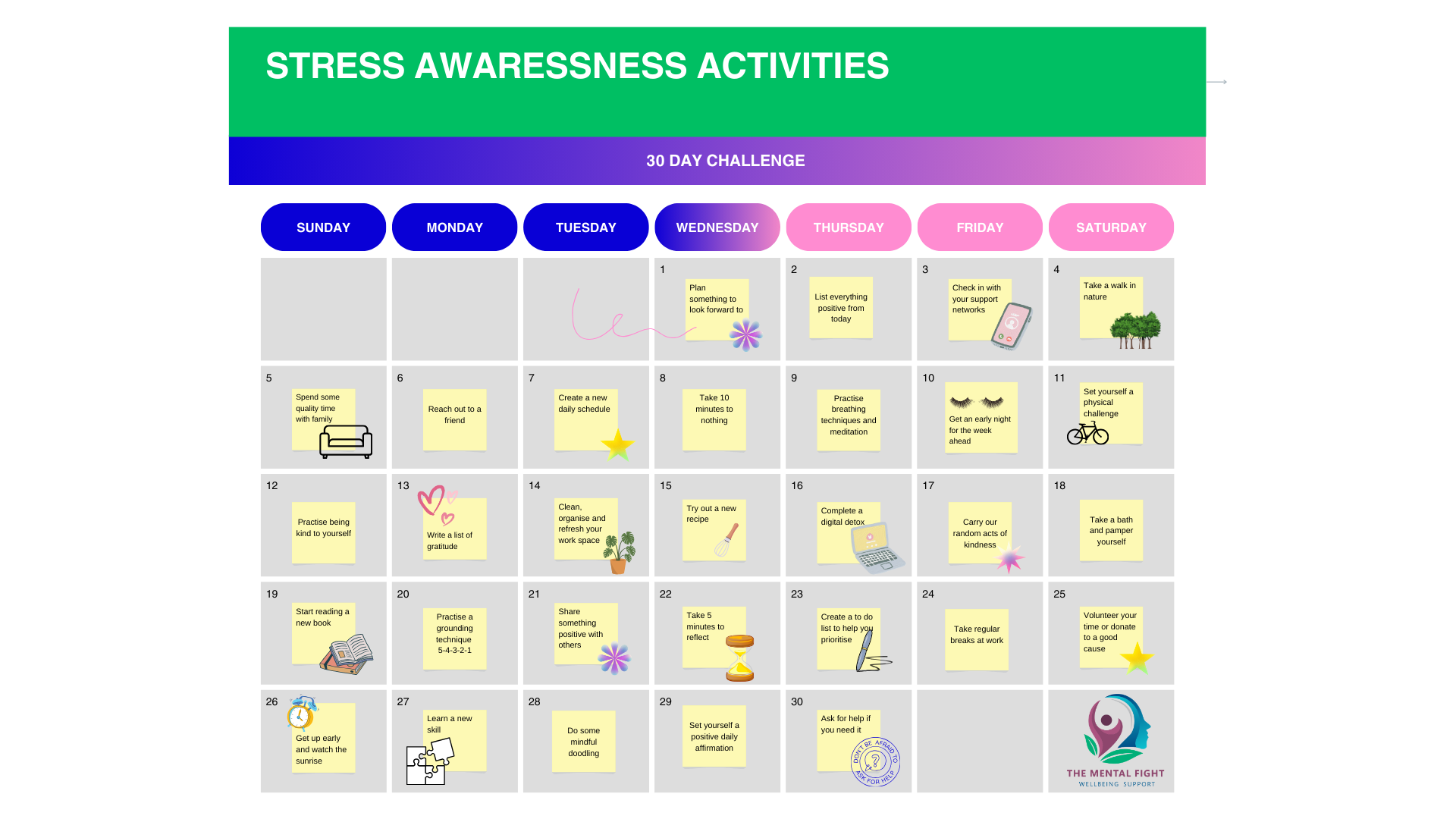 To assist you in considering various strategies you could implement, look at our 30-day challenge for Stress Awareness Week. It may provide you with straightforward and alternative ideas to help you reflect on which strategies you could try to support your emotional wellbeing.
